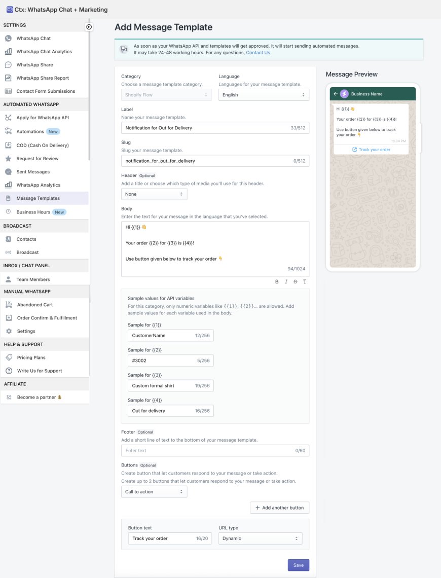 You can start sending various automated WhatsApp notifications with the help of Shopify Flow and Ctx: WhatsApp Chat + Marketing (Shopify App)