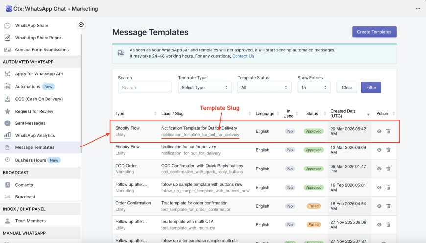 - Copy and paste the Template Slug (as shown in Step 5) from the WhatsApp Templates list in the application.