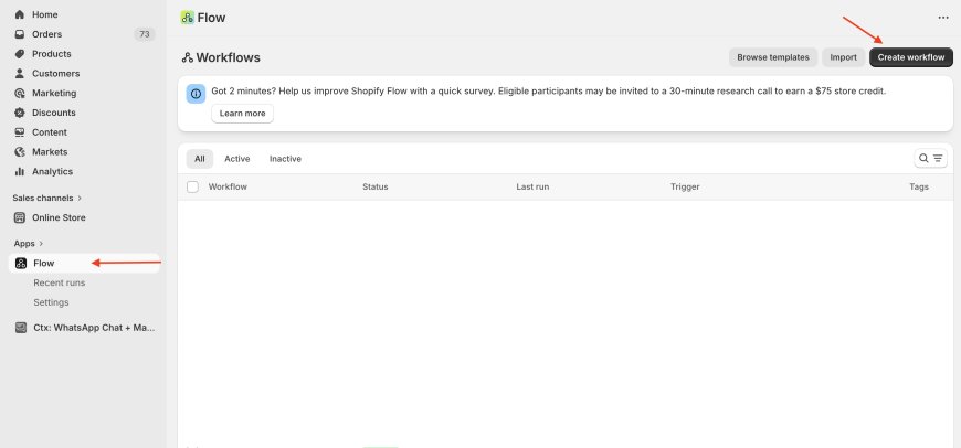 - Now, Open Shopify Flow app available in your Shopify Store admin > Apps. Click on "Create Workflow" as shown in the screenshot below.