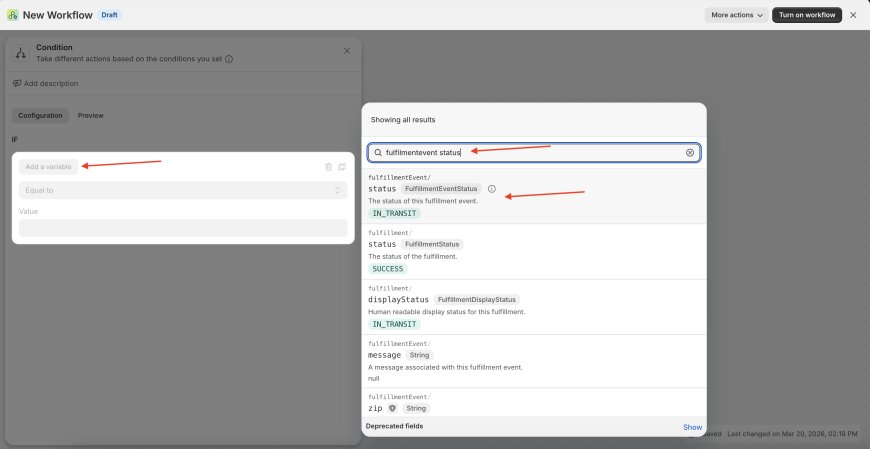 Click "Add a variable" and search for "fulfillmentevent status" and then select "fulfillmentEvent" > "status"