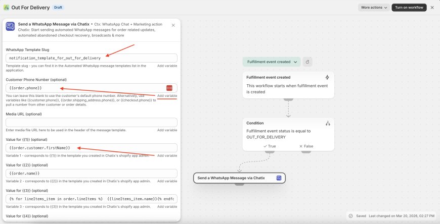 Here is how you can setup the Shopify Flow to start sending an automated WhatsApp message when Order status changed to "Out for delivery" to notify customer that your order is about to be received today / soon. It will help to reduce RTO, because customers will be aware and ready to receive their order.